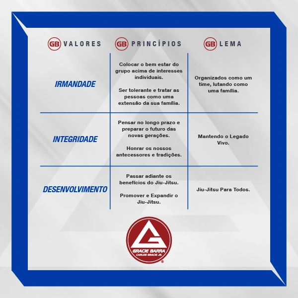 O método Gracie Barra enfatiza a Irmandade, a Integridade e o Desenvolvimento. A Irmandade constrói uma comunidade acolhedora, semelhante a uma família. A Integridade promove o respeito pela tradição, honrando o legado do Jiu-Jitsu.